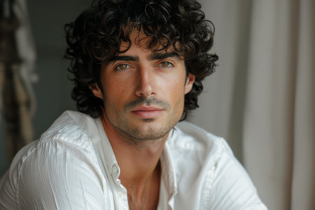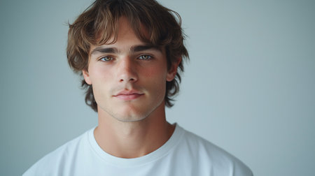 A striking close-up portrait of a young man with wavy brown hair, deep brown eyes, and a relaxed yet confident expression. His smooth skin, subtle facial hair, and soft natural lighting contribute to an effortless and modern aesthetic. Wearing a classic white T-shirt against a muted background, this image evokes simplicity, elegance, and authenticity. Ideal for use in fashion editorials, branding, modeling, or lifestyle projects.