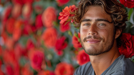 attractive young man with a red rose backdrop grinning and facing the camera.