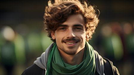Portrait of handsome young man with curly hairstyle and green scarf