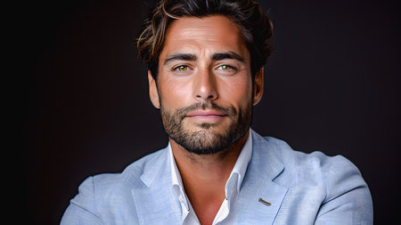 Portrait of a handsome young man with dark hair and blue eyes