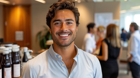 A young man smiles warmly while engaging with colleagues at a networking event.