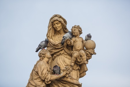 Doves on an ancient sculpture of St. Anne on the Charles Bridge closeup