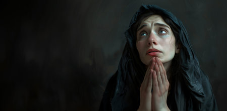Religious young woman praying to God, on dark background.