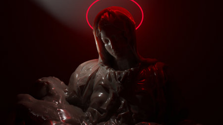 A modern reinterpretation of Michelangelo Pieta, blending 3D graphics and neon lighting. The Virgin Mary cradles Jesus, her halo glowing with vibrant neon hues, symbolizing holiness amidst sorrow. Dynamic camera movement