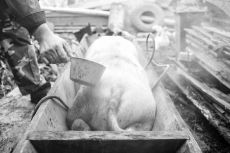 Two butchers sprinkle slaughtered pig with boiling water , hair removal, preparation to cutting, Western Ukraine