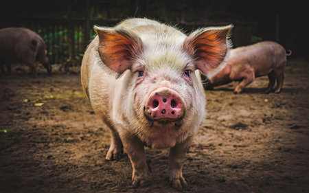 A curious and friendly spotted piglet stands in a muddy field, its ears glowing in the warm, golden light of a beautiful sunset. This charming close-up captures a moment of innocence and connection with nature on a rustic farm, highlighting the simple joys of rural life.