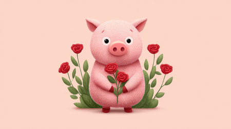 This delightful illustration features a cute cartoon pig holding beautiful roses, surrounded by flowers on a soft pastel background. Perfect for children