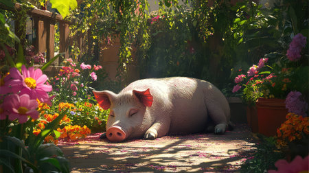 A charming pig rests peacefully on a sunlit path, surrounded by vibrant flowers and lush greenery, creating a tranquil scene of nature's beauty.