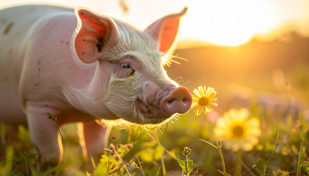 In the warm, golden glow of a setting sun, a gentle pig pauses in a field of wildflowers. With a curious and content expression, it leans in to smell a bright yellow flower, capturing a serene moment of simple joy and connection with nature.