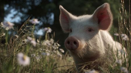 This image features a charming piglet resting in a meadow filled with wildflowers, bathed in soft morning light, showcasing the beauty of nature.