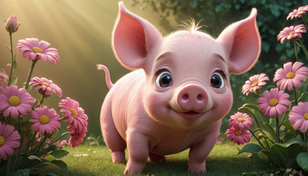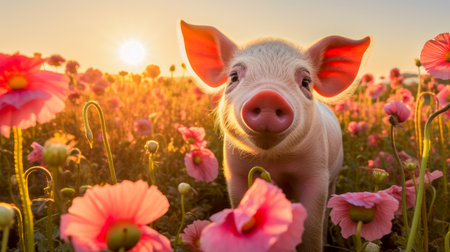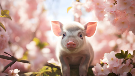A delightful pink piglet stands amidst a dreamy pink blossom field, radiating charm and innocence. The serene atmosphere reflects the beauty of nature.