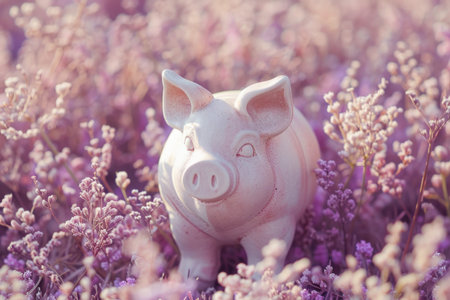A ceramic piggy bank sits surrounded by a sea of soft purple flowers, capturing a whimsical, dreamlike savings concept.