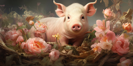 Illustration of a pig in a floral ornament. Oil painting style with cinematic light.