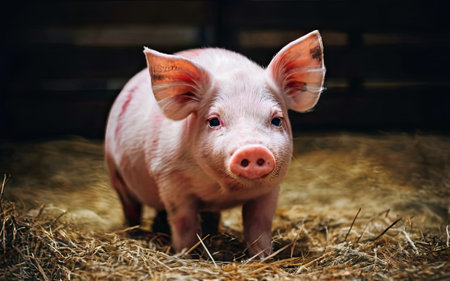 An adorable baby piglet sits against a soft pink background, showcasing its charming personality and playful nature, ideal for animal lovers and marketing projects.