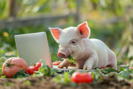 A funny and adorable picture of a little pigsitting in a garden with tomatoes and looking at a laptop, humorous internet jokes. High quality photo