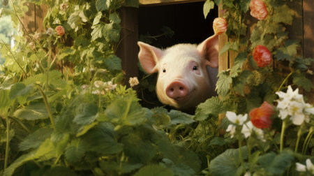 a pig nestled in a bush, surrounded by vibrant flowers and lush plants. the softbox lighting enhances the farm security administration aesthetics, reminiscent of the works of bill gekas and adrianus eversen. this close-up uhd image captures the rustic charm of cabincore. ai generated