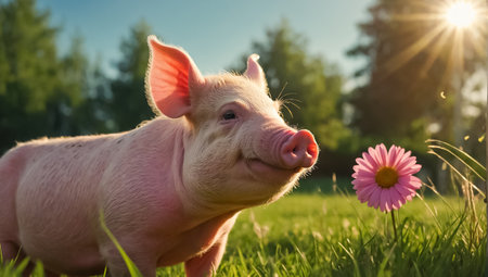 A charming young pig stands in a sunlit green field, embodying the essence of farm life. The warm atmosphere and soft light create a serene scene in nature.