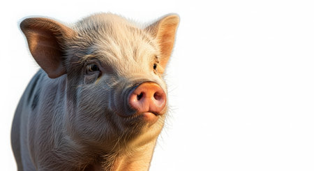 A close-up captures a young pig's head, highlighting its pink snout, ear, and eye. The image uses soft lighting, enhancing the texture of its skin and fur. The composition is simple, suggesting a focus on the subject. This image may be suitable for various commercial or editorial uses.