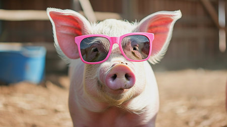 Charming piglet with pink glasses, radiating joy and cuteness against a colorful background. High quality photo
