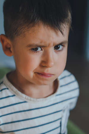 Child grimaces while standing at home, posing looking at camera. Childhood concept. People emotions lifestyle concept. Closeup portrait.