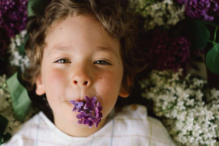 Portrait of a happy boy in lilac flowers. Happy childhood. Spring time
