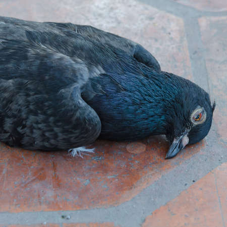 Dead black pigeon bird on floor