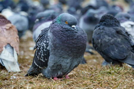 Feral pigeon, common grey city dove, birds in the city up close, urban birds group simple closeup, detail. Animals up close, city fauna concept, nobody, side view, outdoors scene