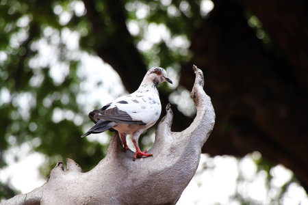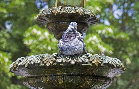 pigeon sitting on a stone fountain in summer