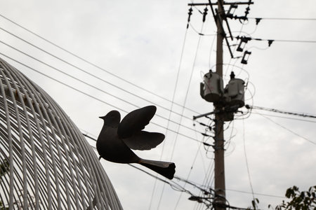 Electricity pole and pigeon sculpture on the roof of a building in Seoul, South Korea