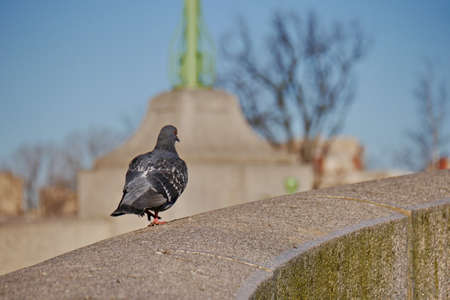Wild gray pigeon sits on the fence of the city embankment next to the pond river, birdwatching wildlife