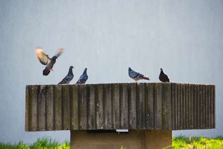 Pigeons in a city. concept of dirty hungry birds in the town.