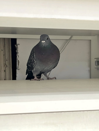A gray pigeon stands confidently on a shelf, displaying its distinct feathers and posture, set against a simple indoor backdrop, illustrating urban wildlife