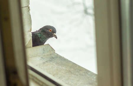Russia - January 2021: a pigeon sits in a feeder. Photographed in Moscow, Russia.