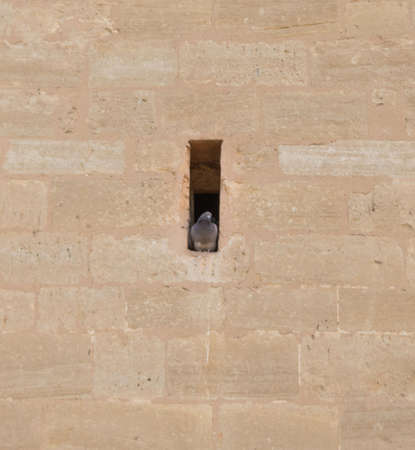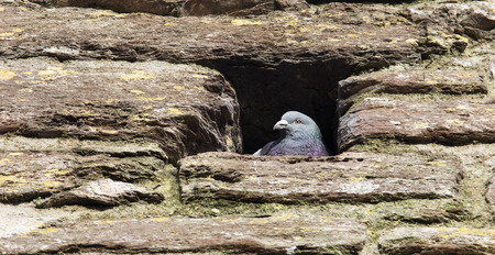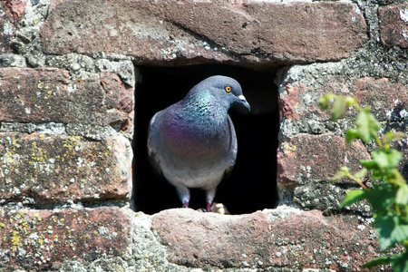 A pigeon surveys the scene from the safety of its perch in an old castle walls in England