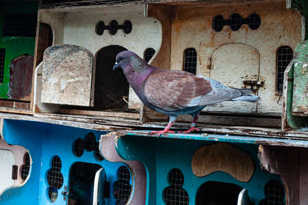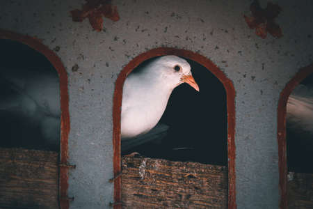 racing pigeon standing in wooden box inside of homing pigeon loft