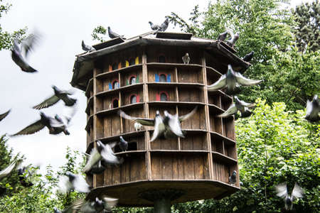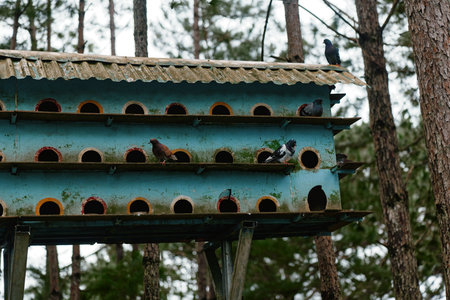 Colorful birdhouse with pigeons in a forest, showcasing nature s beauty and tranquility, perfect for wildlife lovers and home decor themes