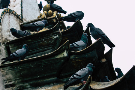 Kathmandu Nepal August 24, 2018 View of pigeons flying around the Shree Gha Stupa Temple located in Naghal district between Thamel and Durbar square in Kathmandu in the morning