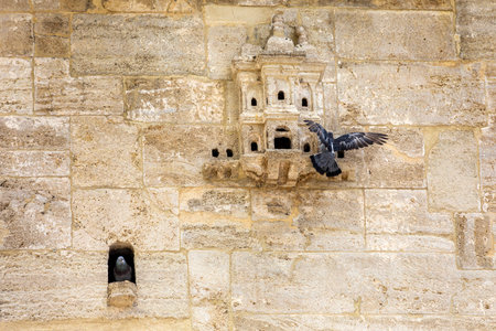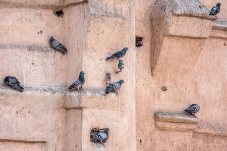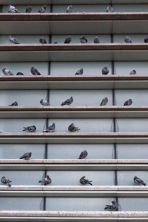 Group of domestic pigeons (Columba livia domestica) sitting and resting in niche of building exterior shelves in the city.