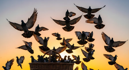 A large flock of pigeons is captured at the moment of being released, exploding outwards from a wicker basket into the sky during a beautiful golden sunrise. The image symbolizes freedom, release, and new beginnings.