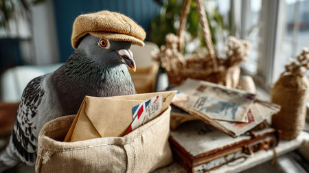 A charming pigeon dons a stylish cap next to a messenger bag, holding a letter, showcasing a delightful blend of whimsy and creativity. Perfect for unique animal-themed projects.