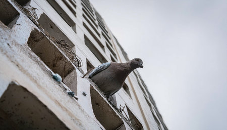 Pigeon nesting problem under the roof of a house that has collapsed into broken wooden beams, 1 pigeon, an AI-powered design tool, and further refined to meet high-quality standards.