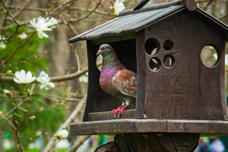 Rock dove in a wooden feeder in a garden with a tree in bloom. Common pigeon bird
