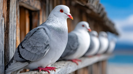 Pigeons with red eyes sitting in a row, resting on an old wooden structure