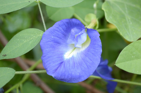 A beautiful Asian pigeonwings flower (Clitoria ternatea) is blooming in the garden. It is also known as butterfly pea, bluebellvine, blue pea, cordofan pea, Darwin pea, nil aparajita, or oporajita.
