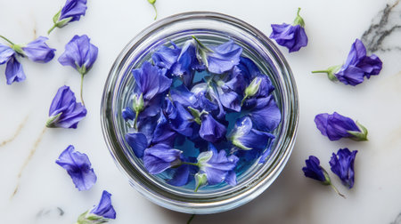 A stunning composition featuring delicate purple petals floating in a clear glass jar. The vibrant flowers are elegantly arranged around the container, creating a serene and tranquil atmosphere, ideal for nature enthusiasts and floral design lovers.