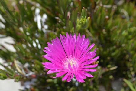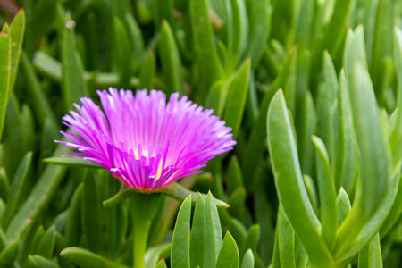 purple spring flower of Carpobrotus edulis among green leaves in the garden