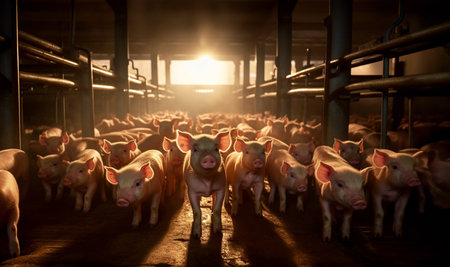 Morning sunlight casting a warm glow on a well-maintained pigsty, where pigs roam freely in a spacious enclosure. Generative AI