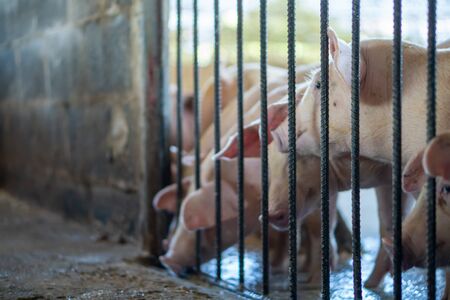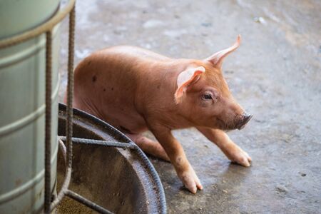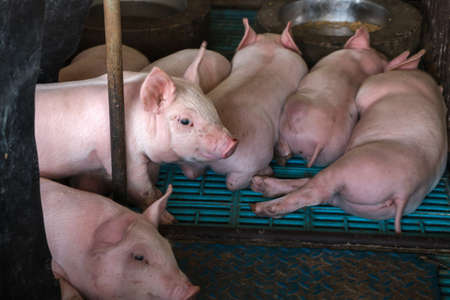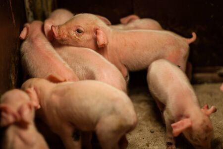 Small piglet in the farm, group of pig indoor on a domestic farm, swine in the stall