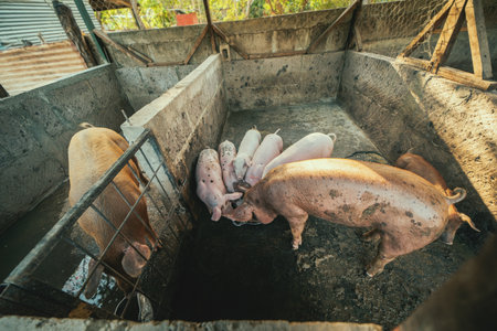 Soft focus of newborn piglets feeding from mother pig in organic farm