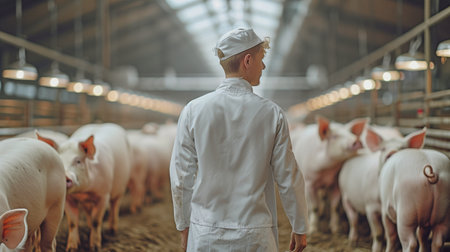 Experienced veterinarian in a large pig farm, monitoring the health of the animals.